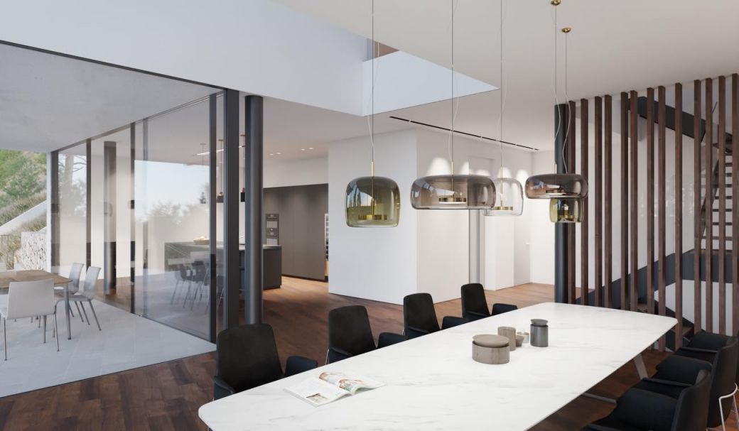Mit 4 Schlafzimmern, 5 Bädern, einem spektakulären Wohnzimmer sowie Esszimmer, Sportbereich, Küche, Arbeitsküche und Gästeapartment auf 1.070m2 genügt die Wohnfläche höchsten Ansprüchen.